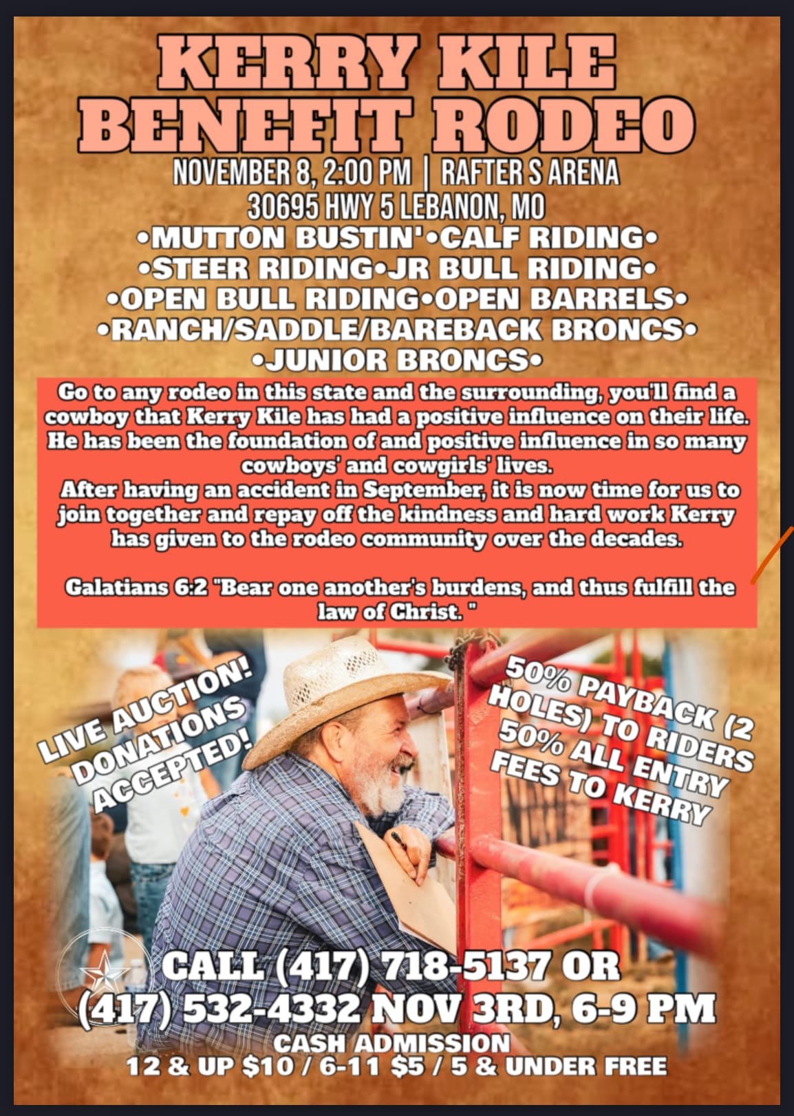 November 8 @ 2:00 pm - 11:30 pm Kerry Kile Benefit Rodeo Rafter S Arena 30695 Highway 5, Lebanon, MO, United States
