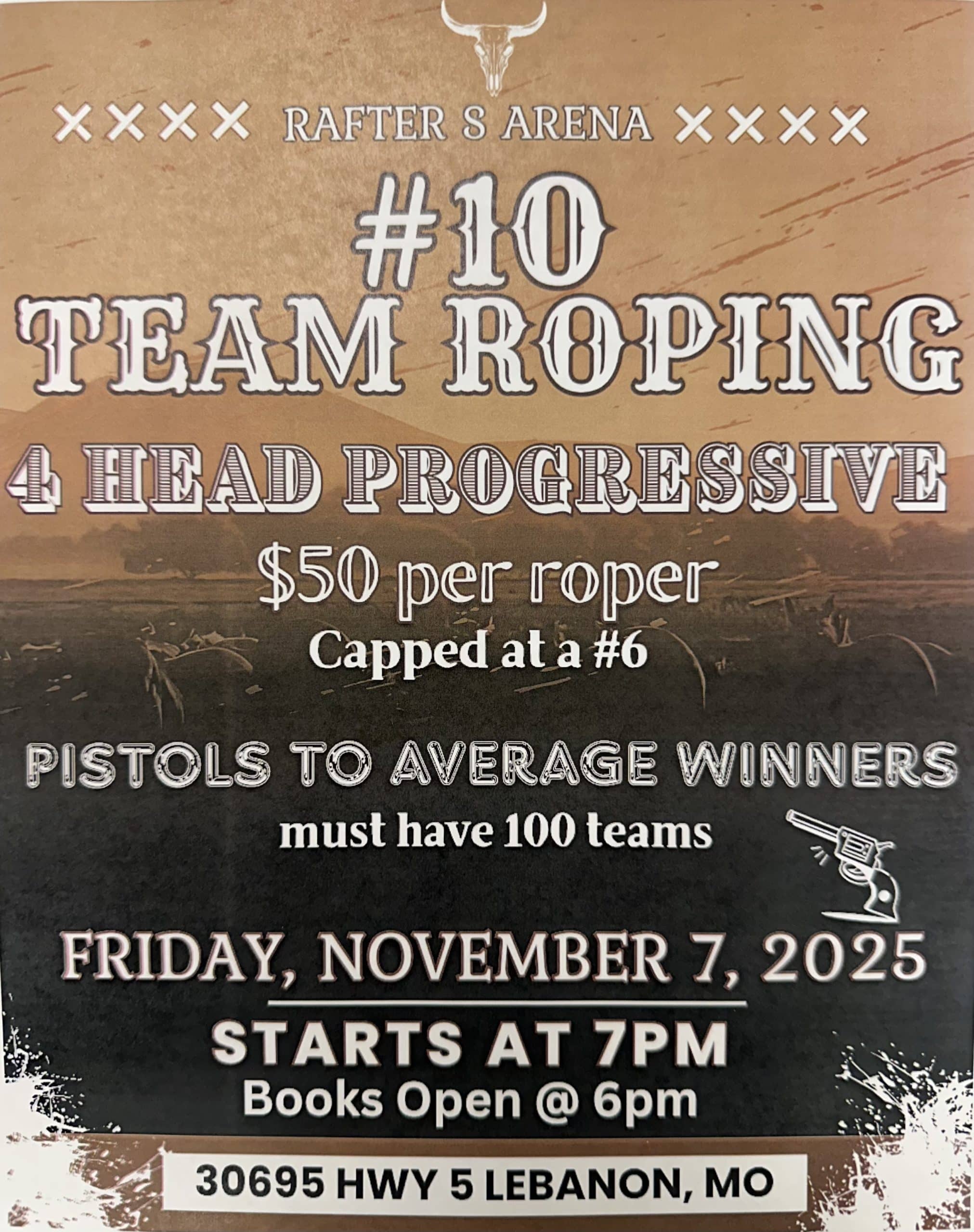November 7 @ 7:00 pm - 11:30 pm Team Roping Rafter S Arena 30695 Highway 5, Lebanon, MO, United States