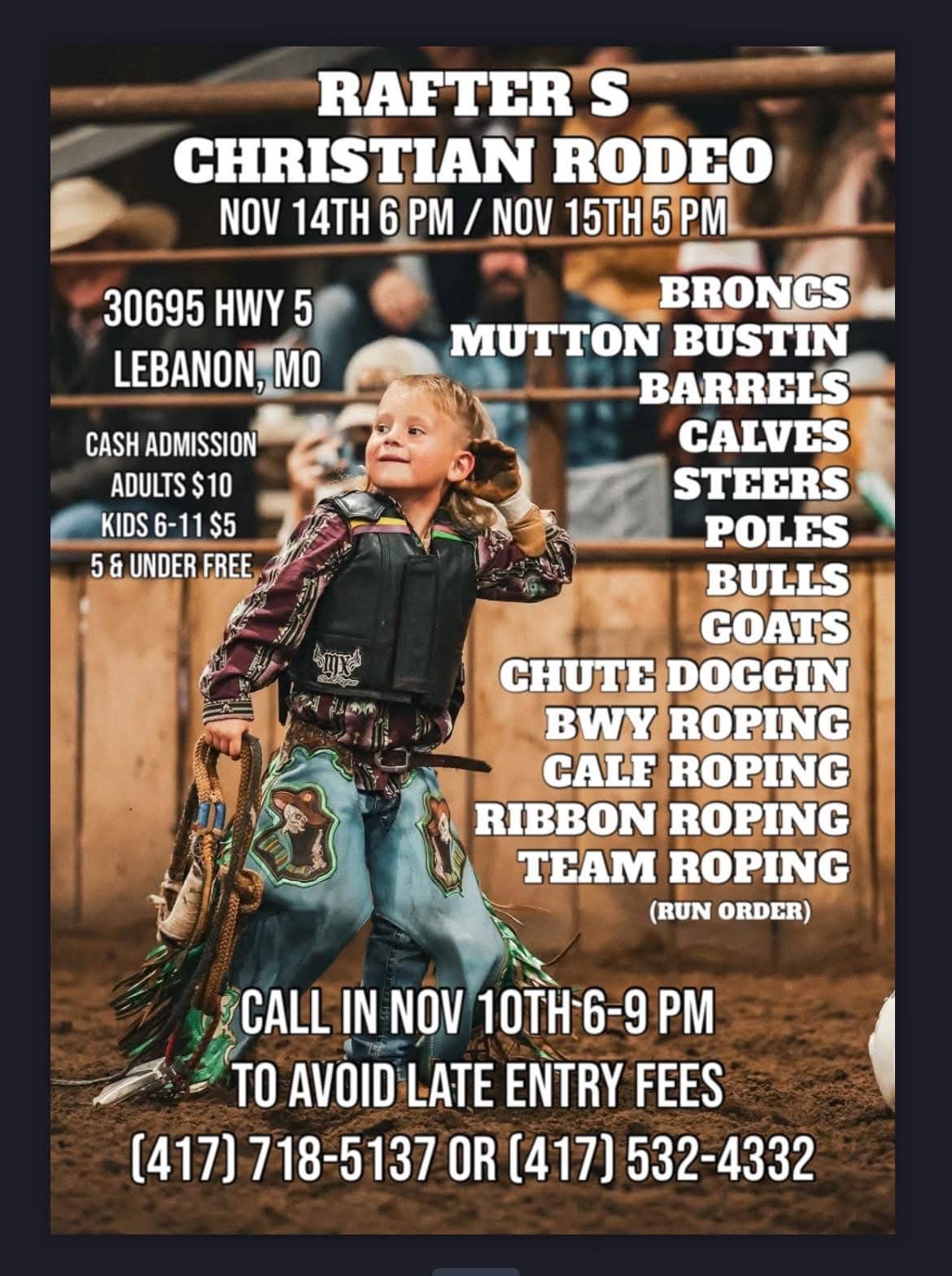 November 14 - November 15 Rafter S Christian Rodeo Rafter S Arena 30695 Highway 5, Lebanon November 14th @ 6:00pm November 15th @ 5:00pm