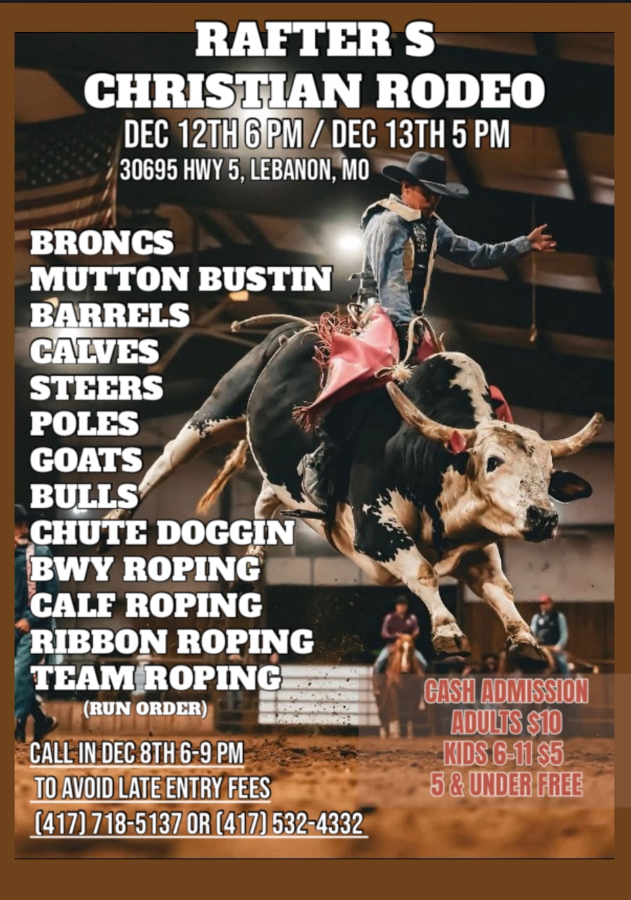 December 12 - December 13 Rafter S Christian Rodeo Rafter S Arena 30695 Highway 5, Lebanon Dec 12th at 6:00pm Dec 13th at 5:00pm
